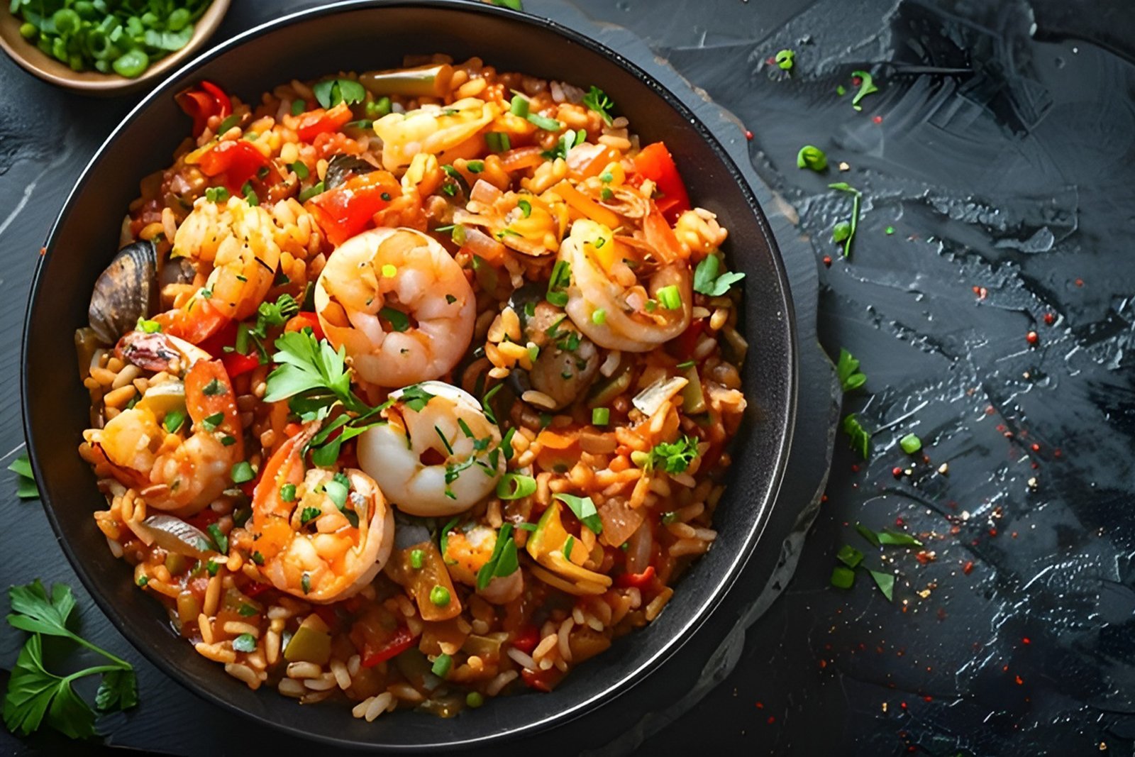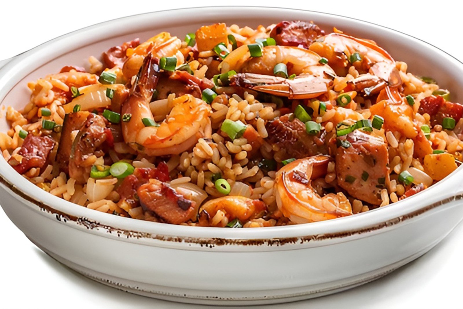An explosion of flavors from the jungle and the sea: seafood fried rice with smoked beef, scrambled egg, scallions, and spicy cabanossi sausage.