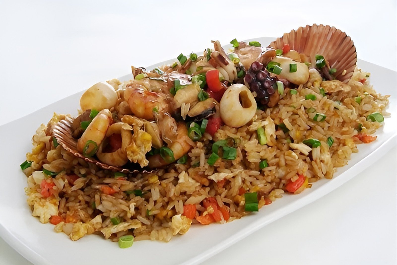 Peruvian-Chinese style fried rice with a generous portion of sautéed seafood, soy sauce, and ginger.