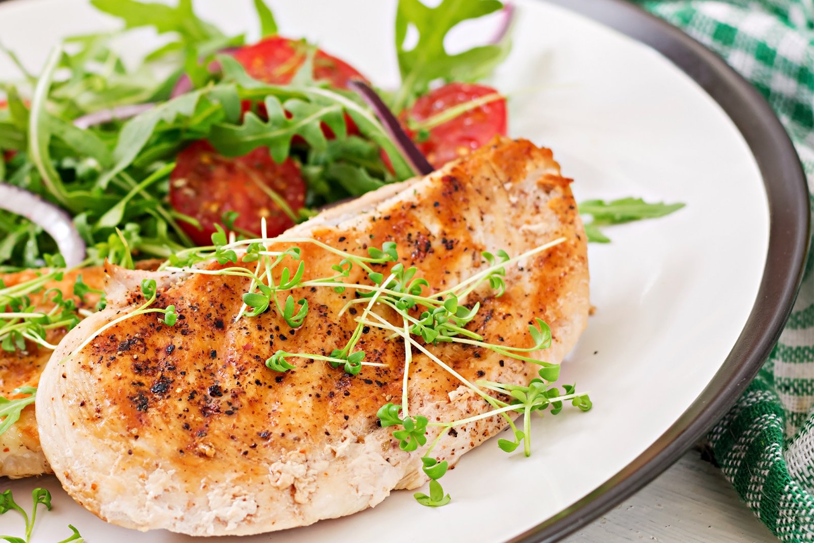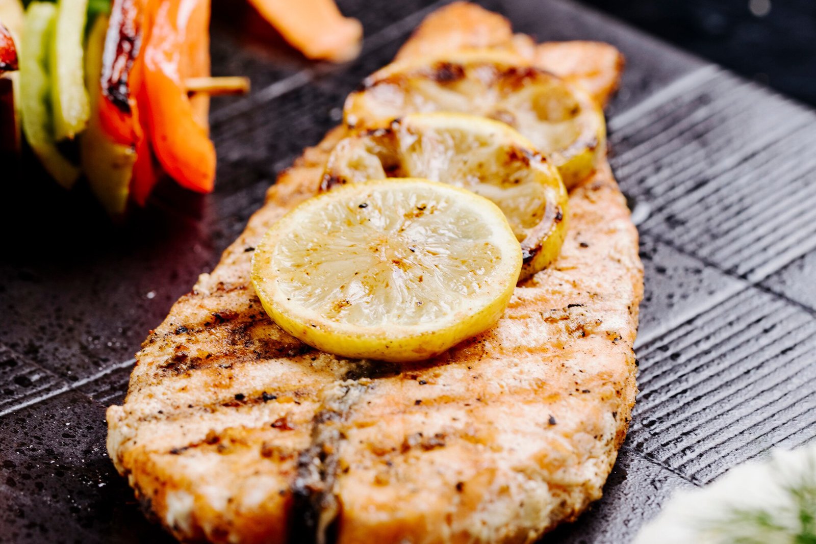 Juicy grilled fish fillet, seasoned with herbs. Served with a fresh salad and rice.