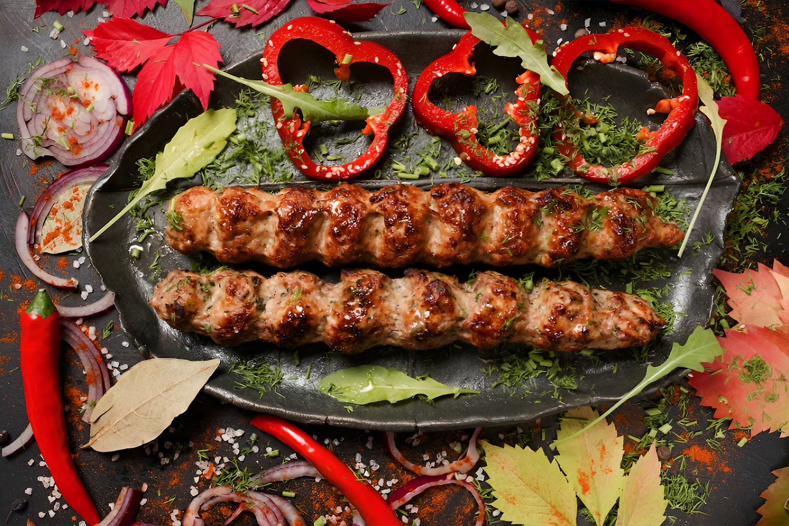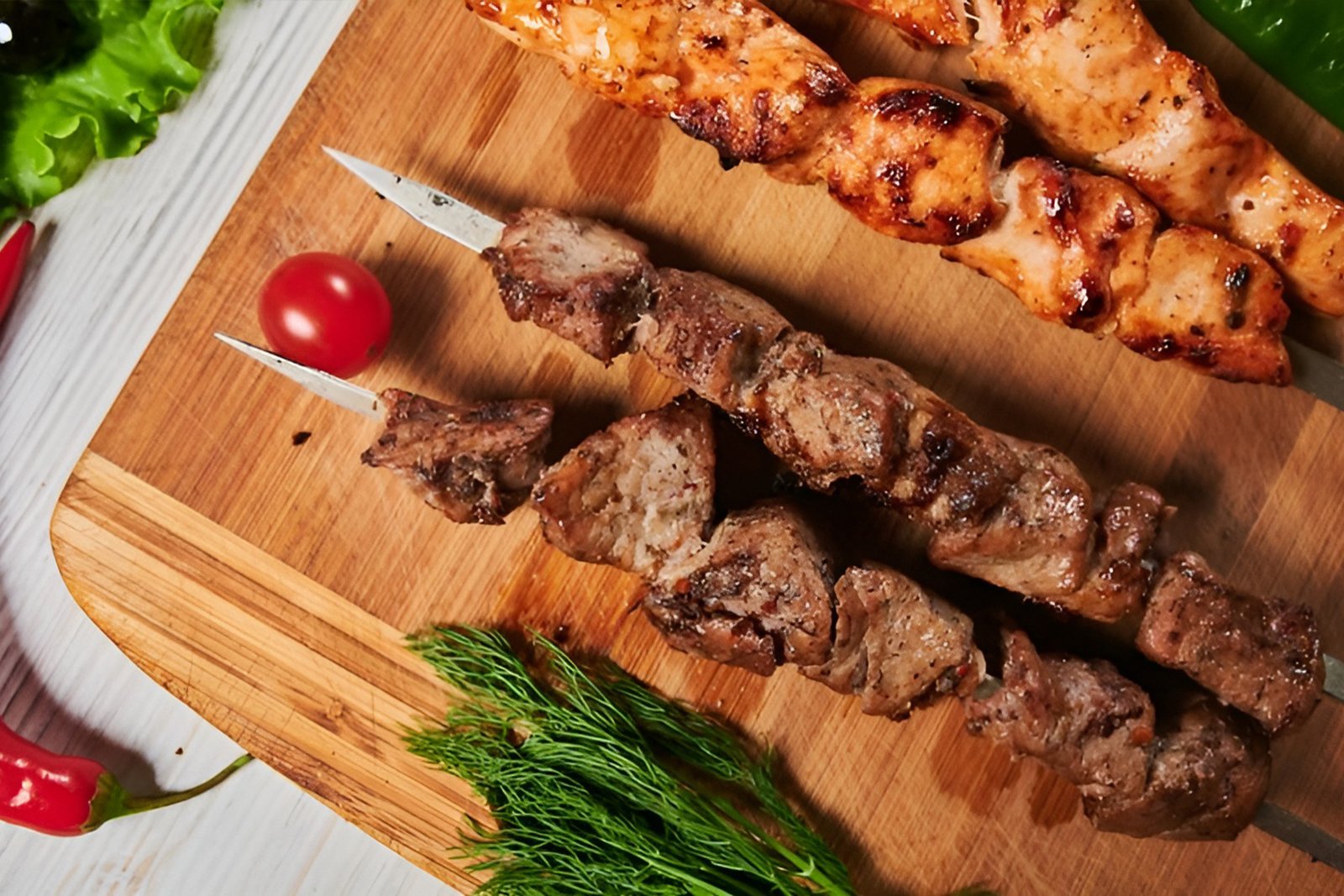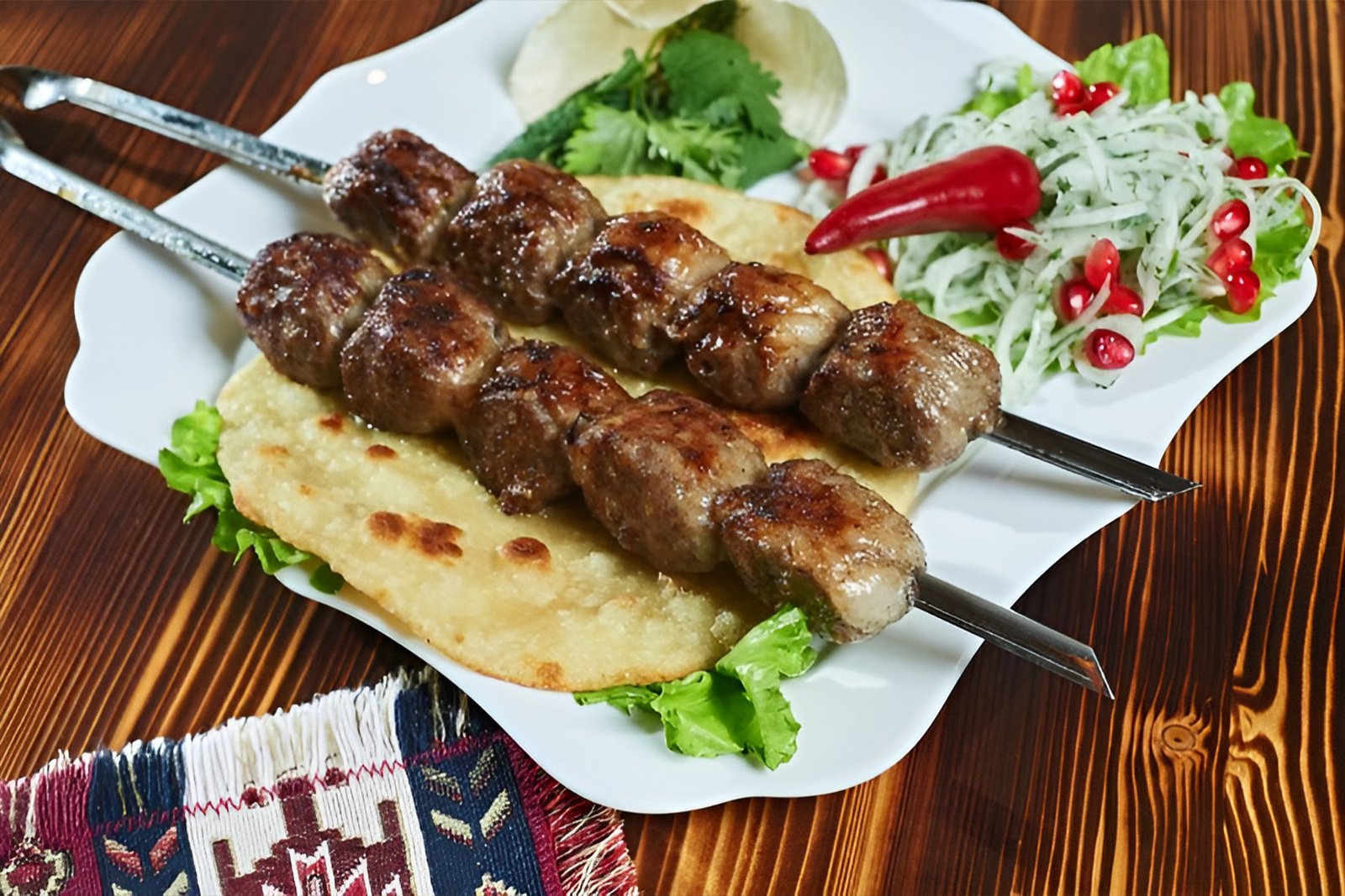 Two skewers of lamb marinated in Eastern spices and grilled. Served with hummus and pita bread.