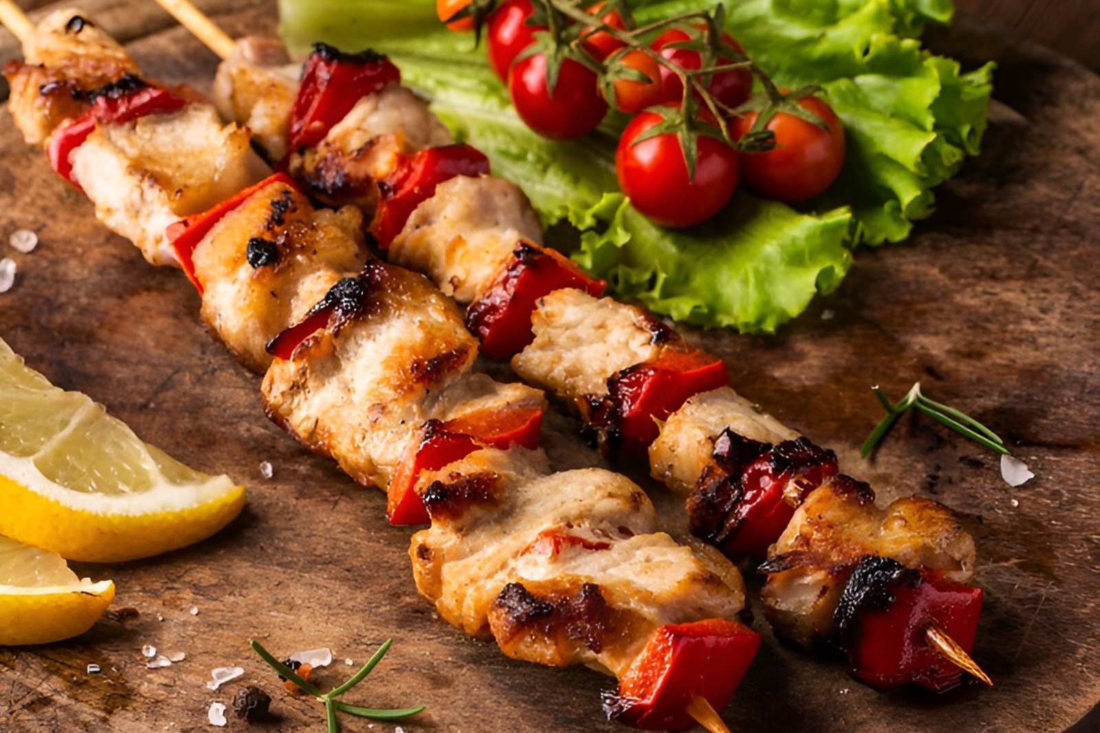 Two skewers of chicken marinated in herbs and spices. Served with hummus and pita bread.