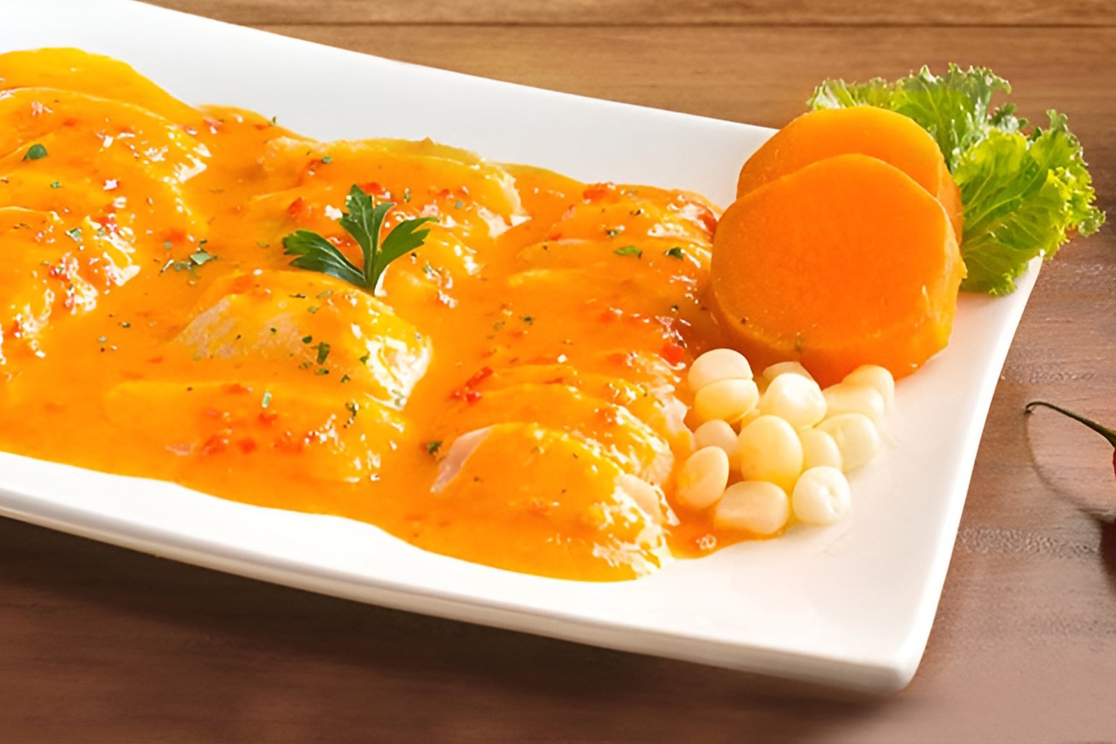 Thin slices of fresh fish, covered in a creamy rocoto or yellow chili sauce. An elegant and flavorful dish.