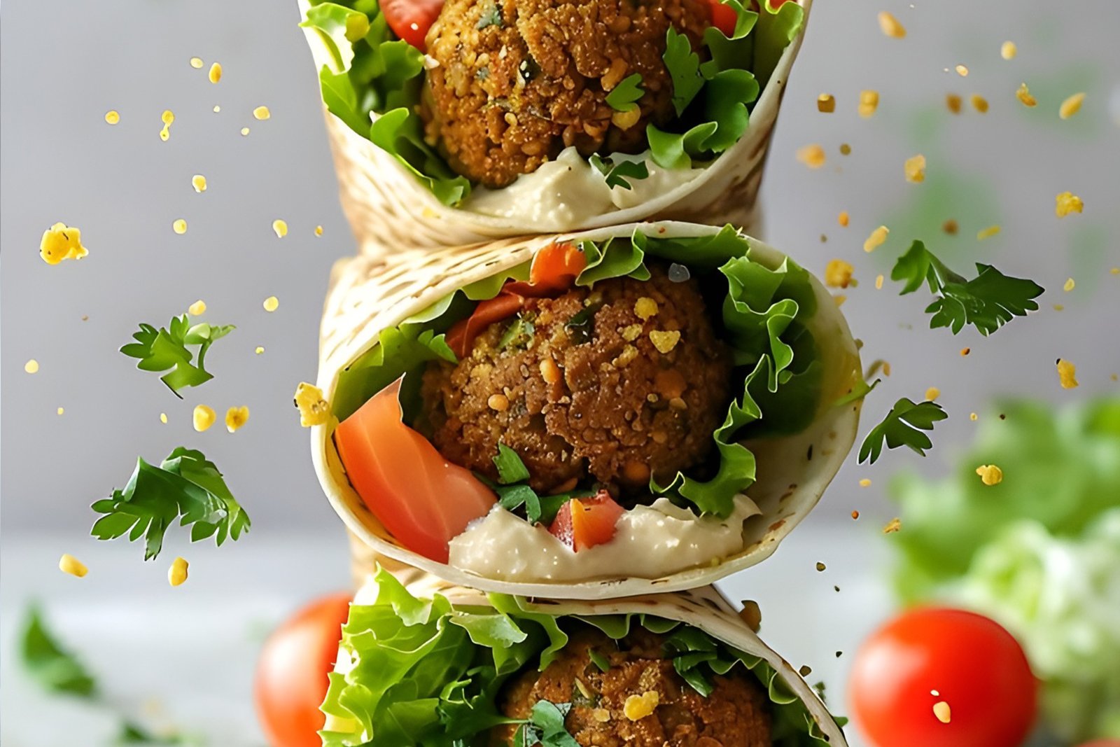 Spiced chickpea fritters with fresh salad, wrapped in Arabic bread.