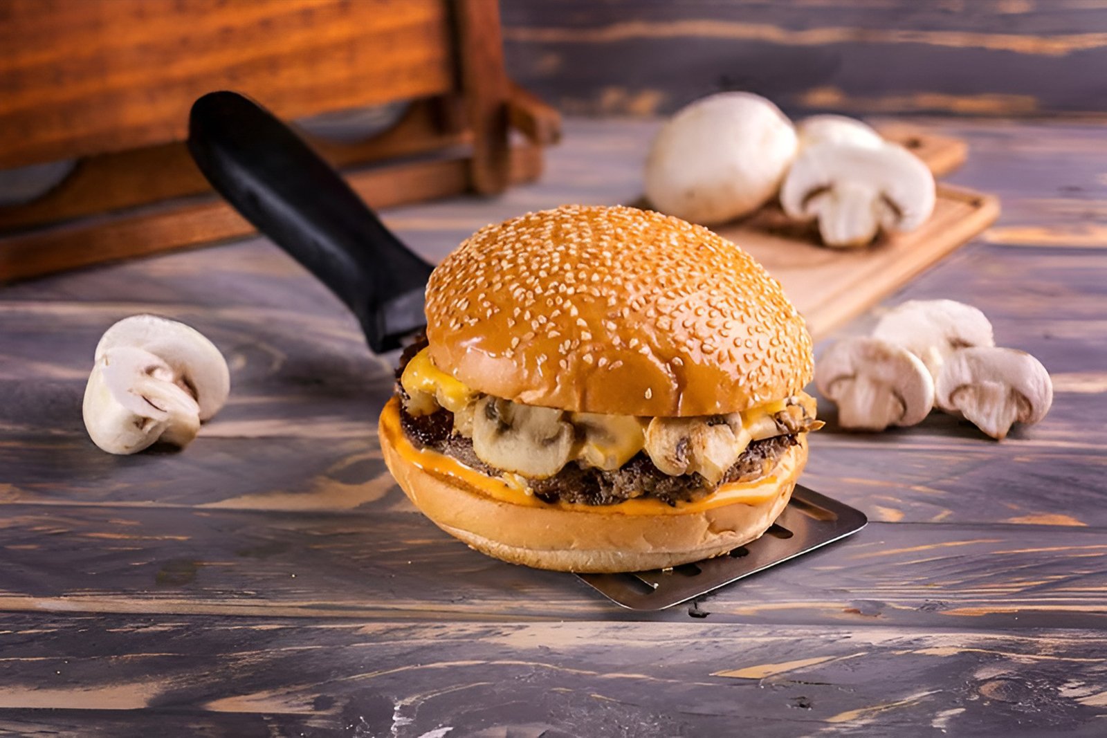 A gourmet experience: beef patty with mushrooms, caramelized onion, and a fried egg. Served with french fries.