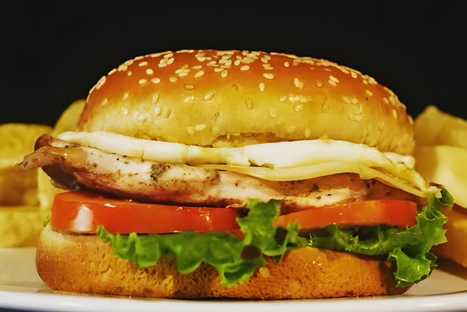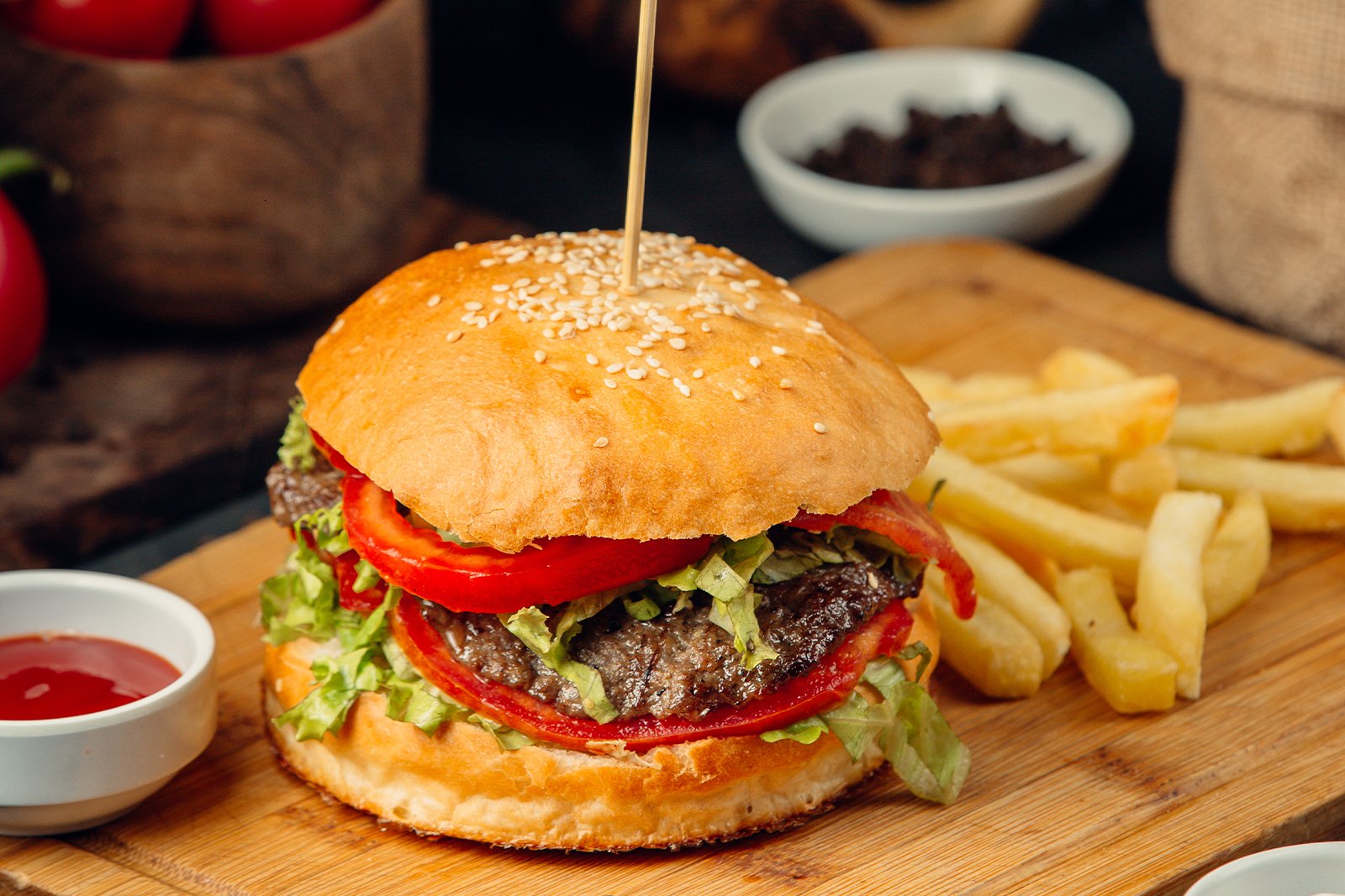Grilled beef patty, served with french fries, lettuce, and tomato.