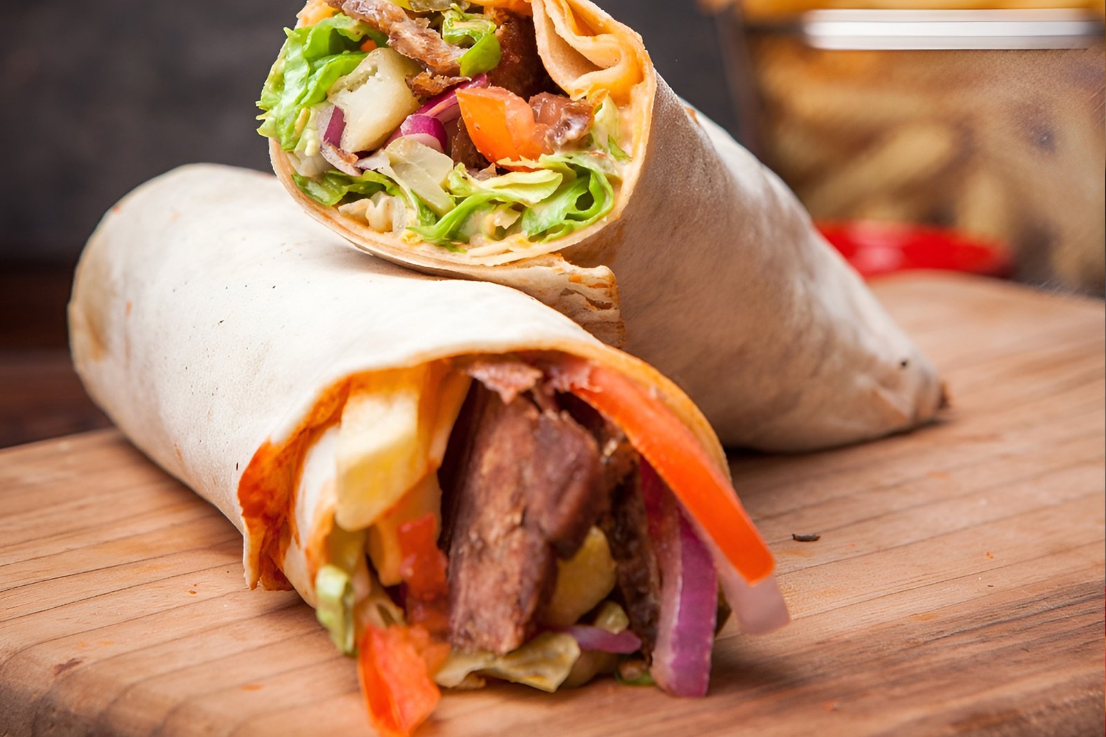 Spiced, marinated beef strips with salad and yogurt sauce, in Arabic bread.