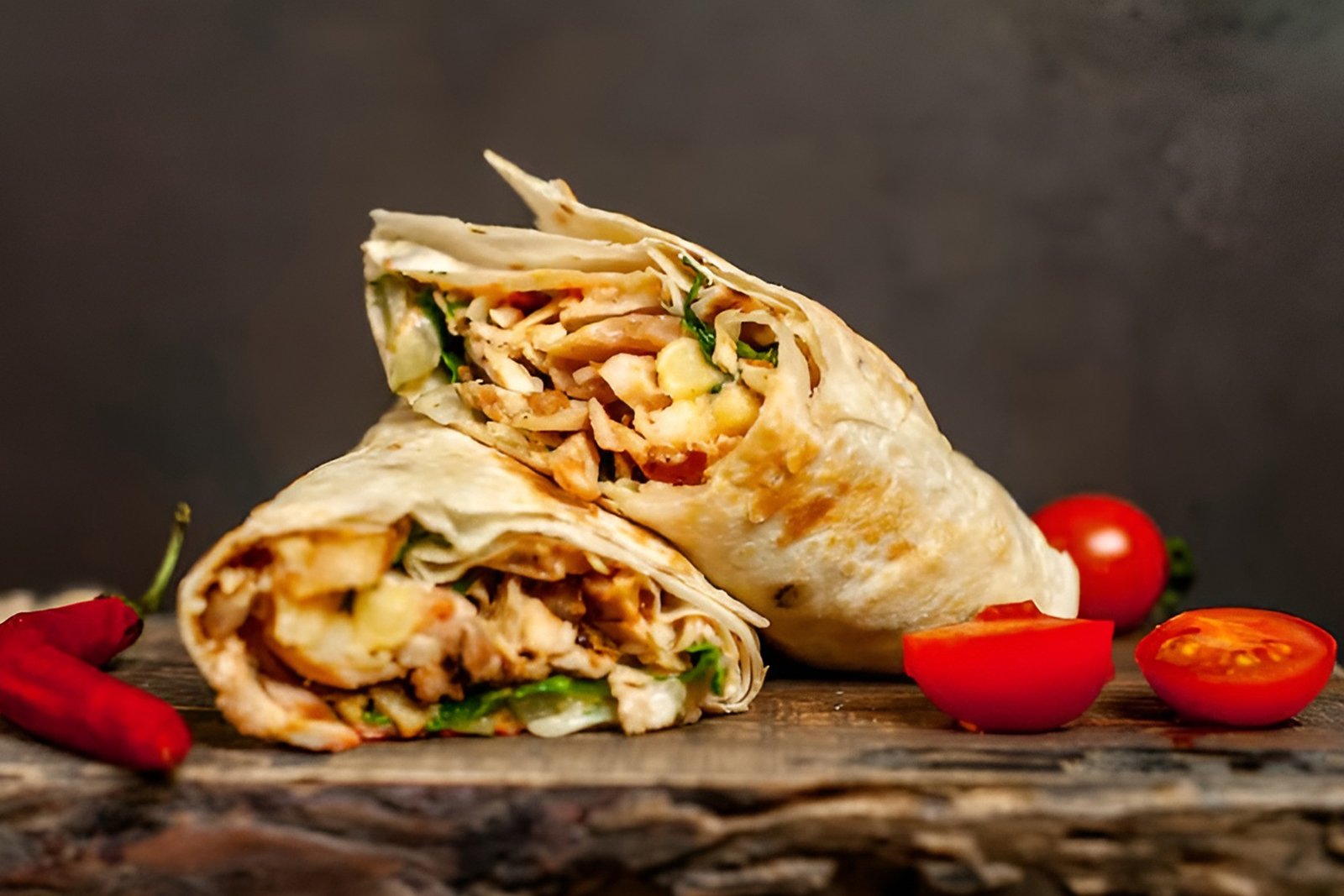 Marinated chicken strips with spices, salad, and yogurt sauce, in Arabic bread.